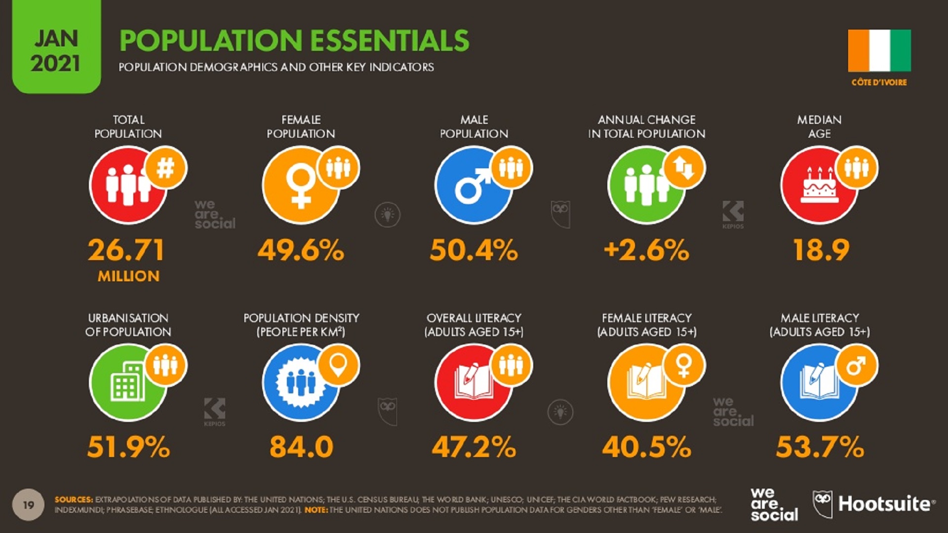 - La Côte d’Ivoire comptait 26,71 millions d’habitants en janvier 2021. Ce nombre a augmenté de plus de 02,6%, soit une ascension de 666 mille personnes entre janvier 2020 et janvier 2021.