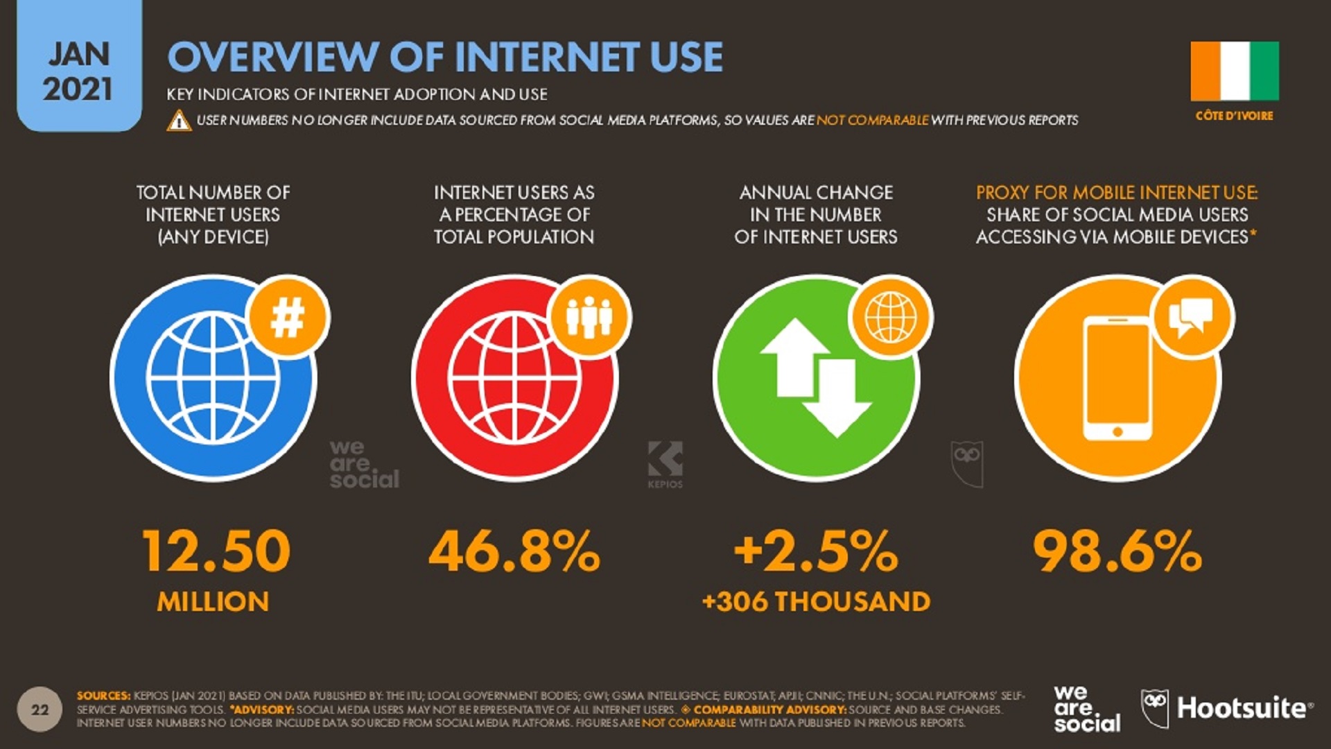 En janvier 2021, la Côte d’Ivoire comptait 12,50 millions d’internautes. Ce nombre a connu une hausse de 306 mille cybernautes (+ 02,5%) entre 2020 et 2021. Le taux de pénétration d’Internet était de 46,8% en janvier 2021.